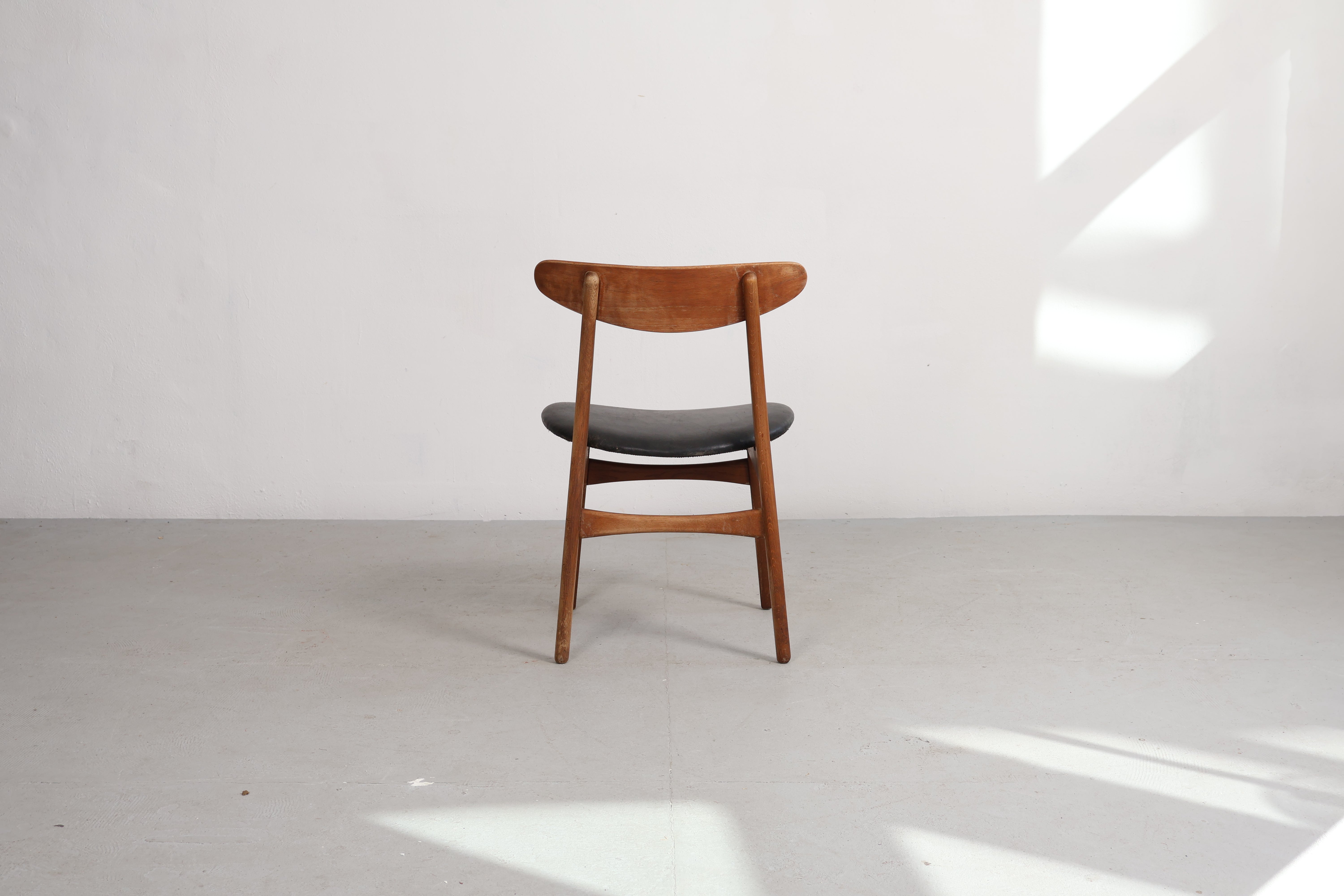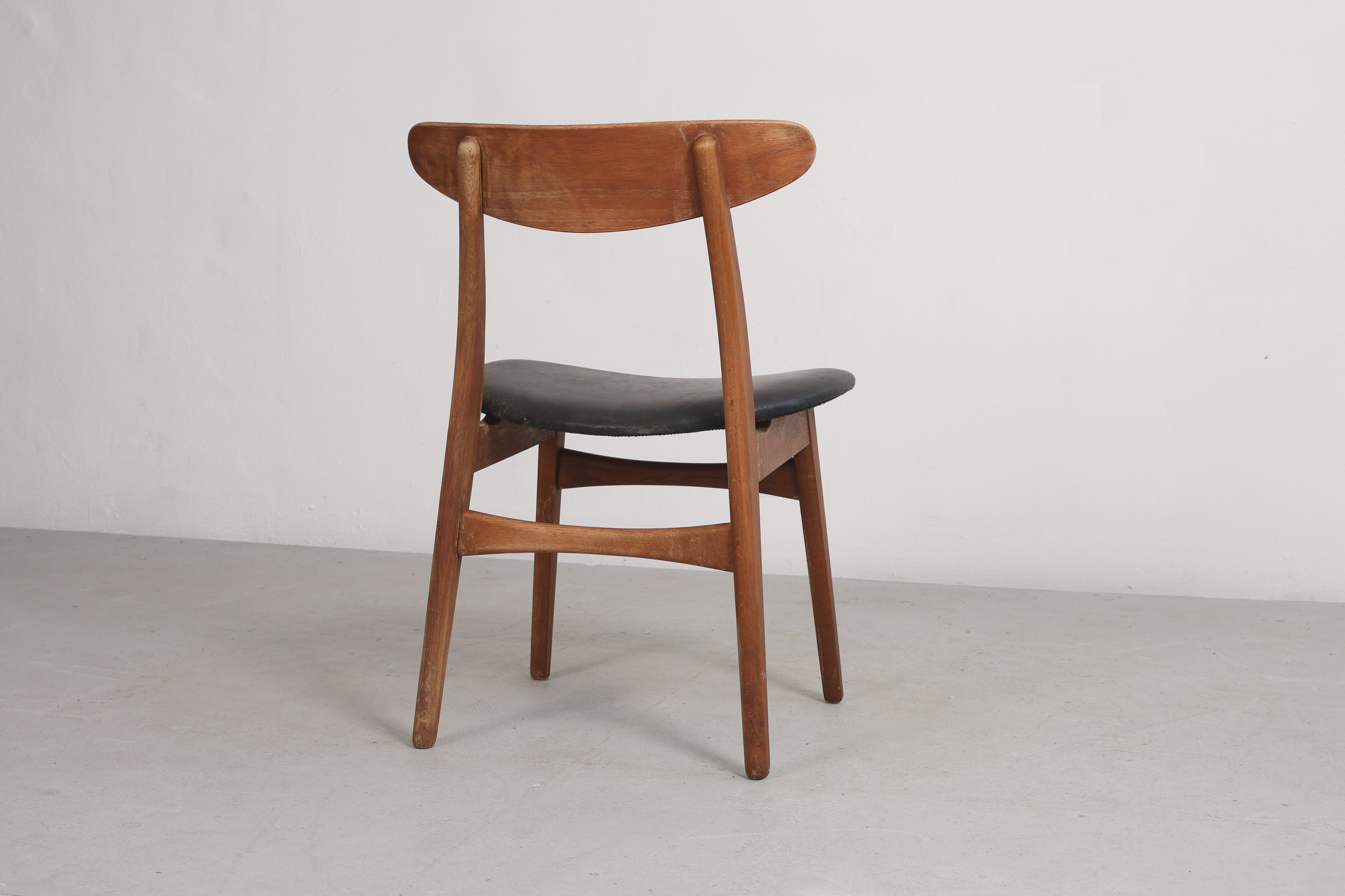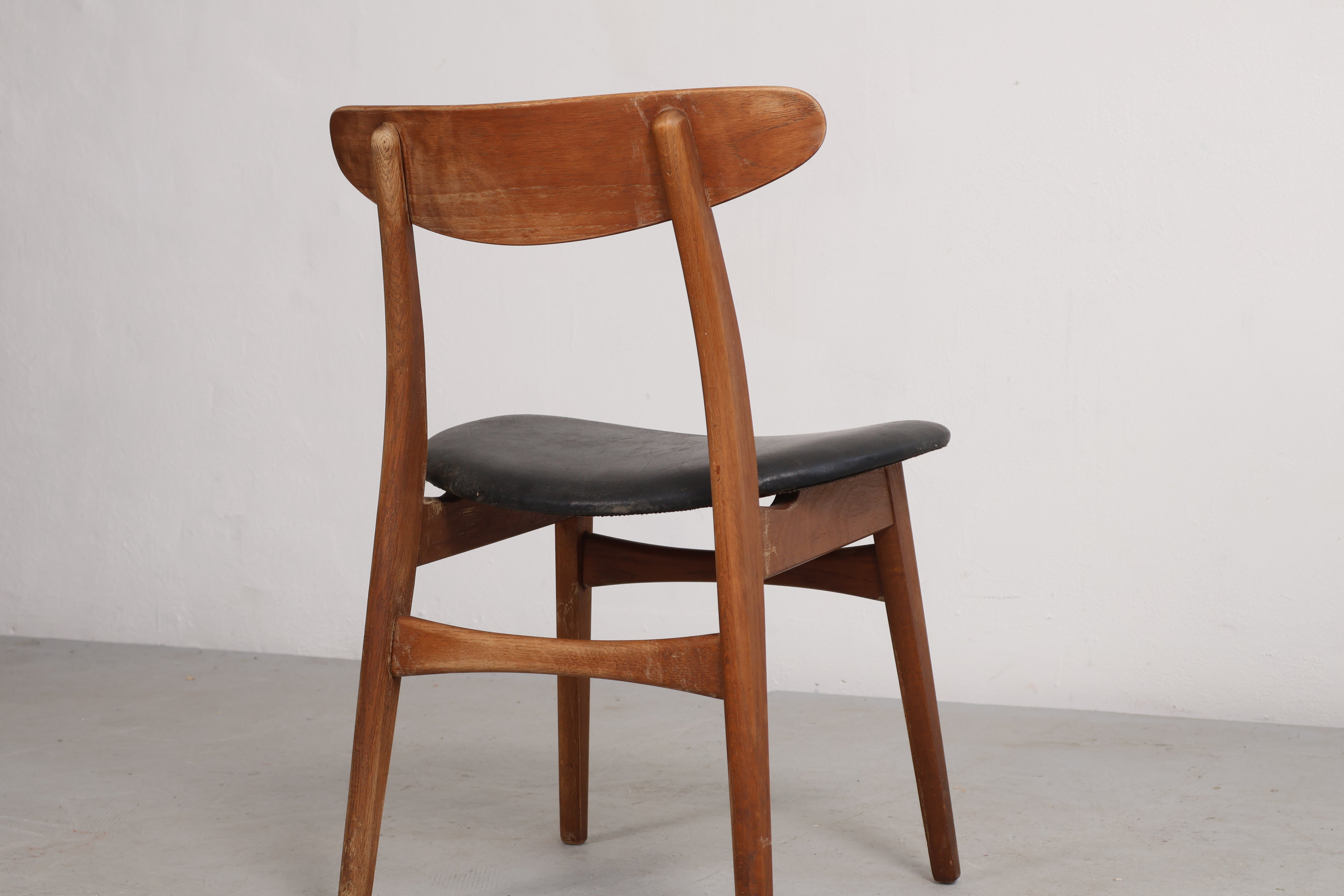 Stuhl aus den 60er-Jahren von Hans Wegner für Carl Hansen & Son. Hergestellt in Dänemark. Gefertigt aus Teak. Höhe 79 cm, Breite 52 cm, Tiefe 47 cm.