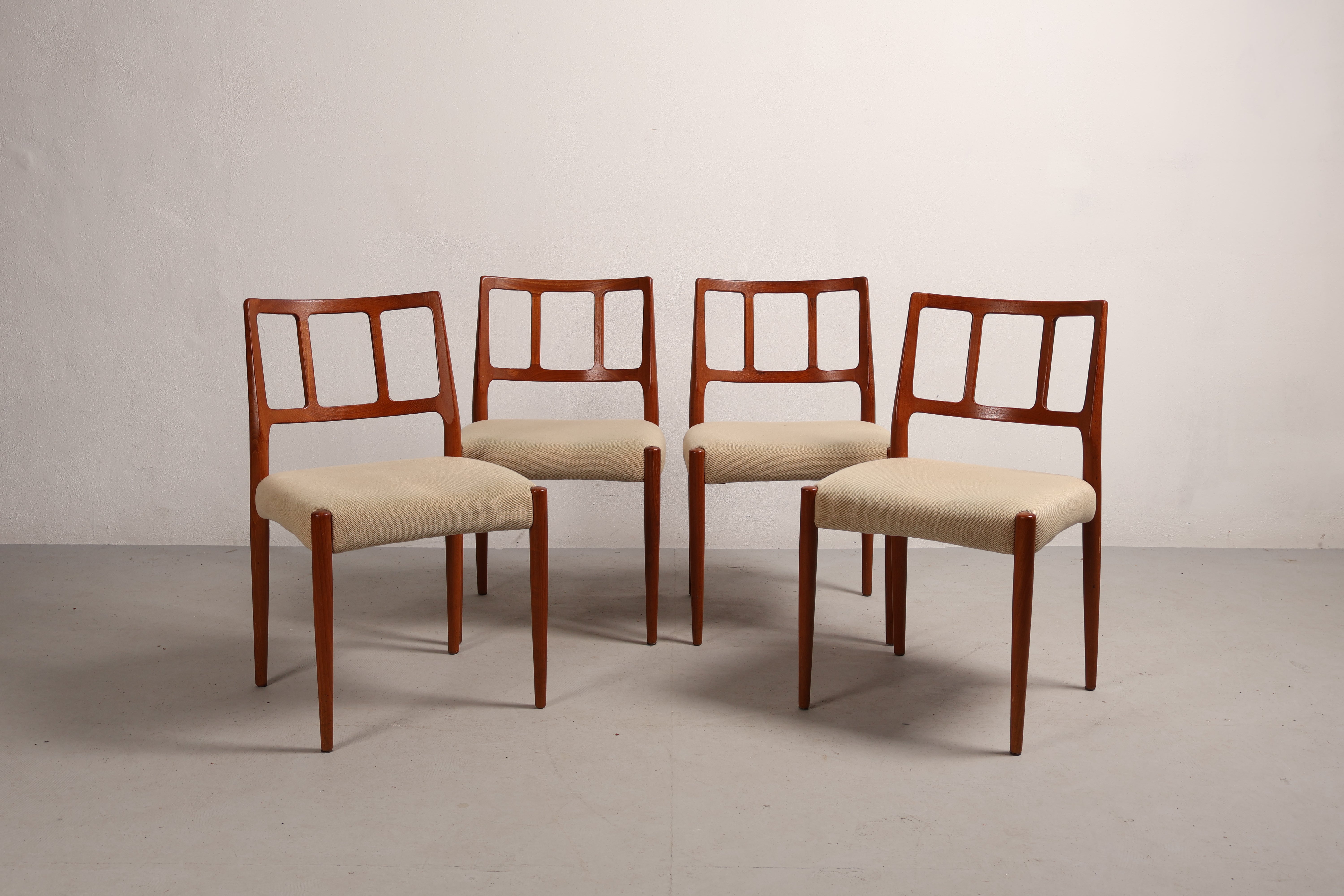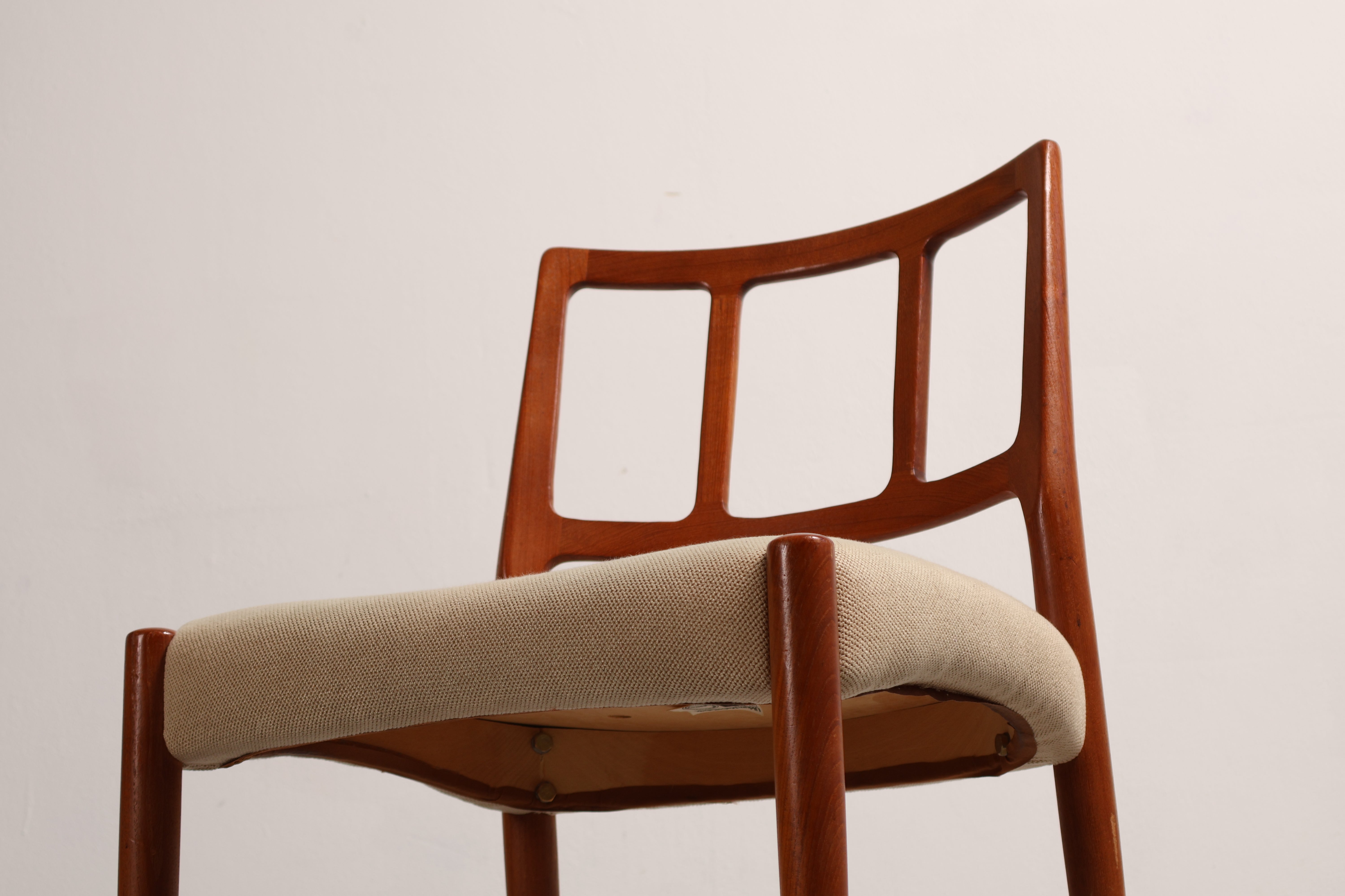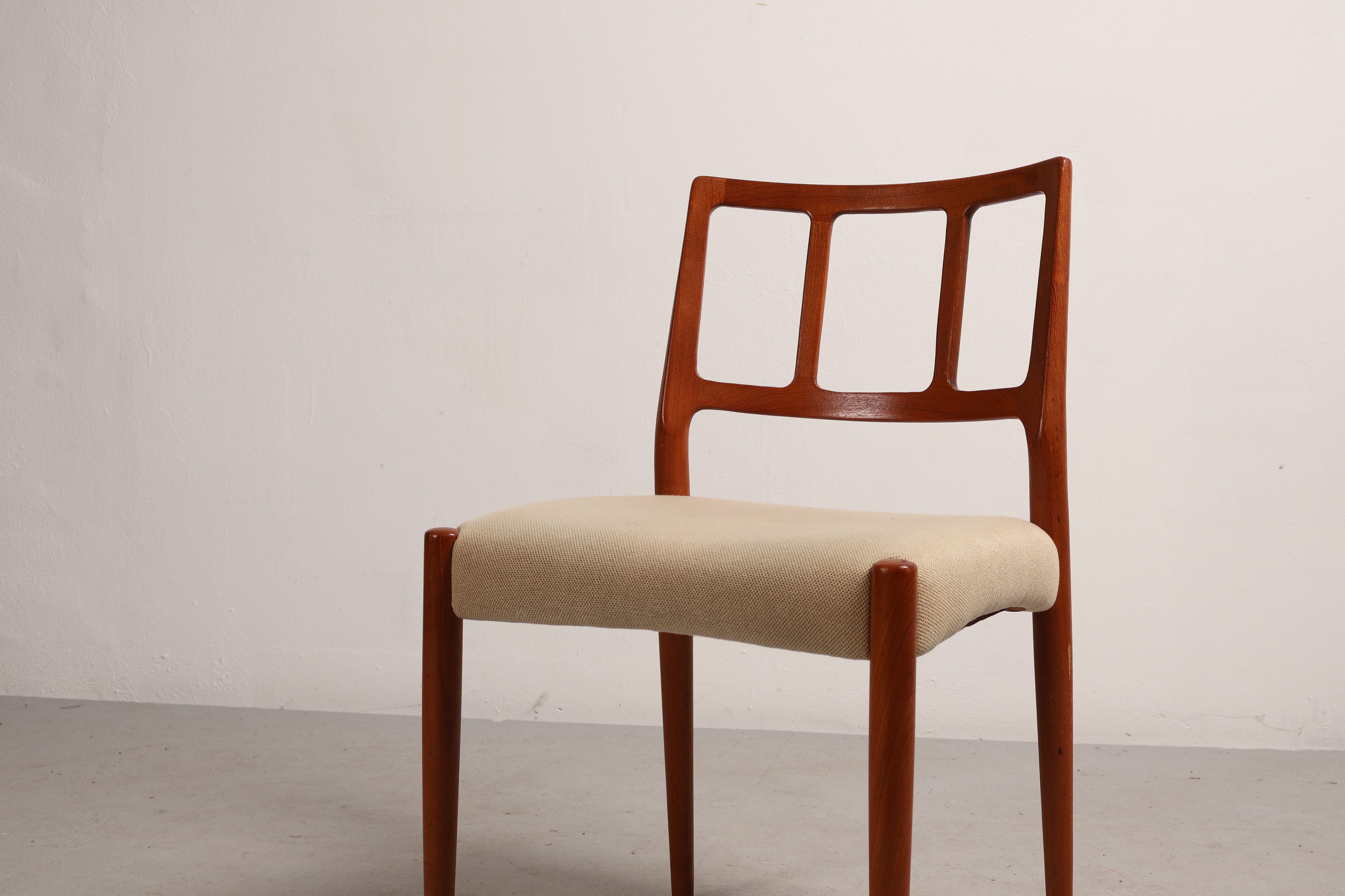 Stuhl aus den 50er-Jahren von Johannes Andersen für Uldum Møbelfabrik. Hergestellt in Dänemark. Gefertigt aus Teak. Höhe 80 cm, Breite 48 cm, Tiefe 54 cm.
